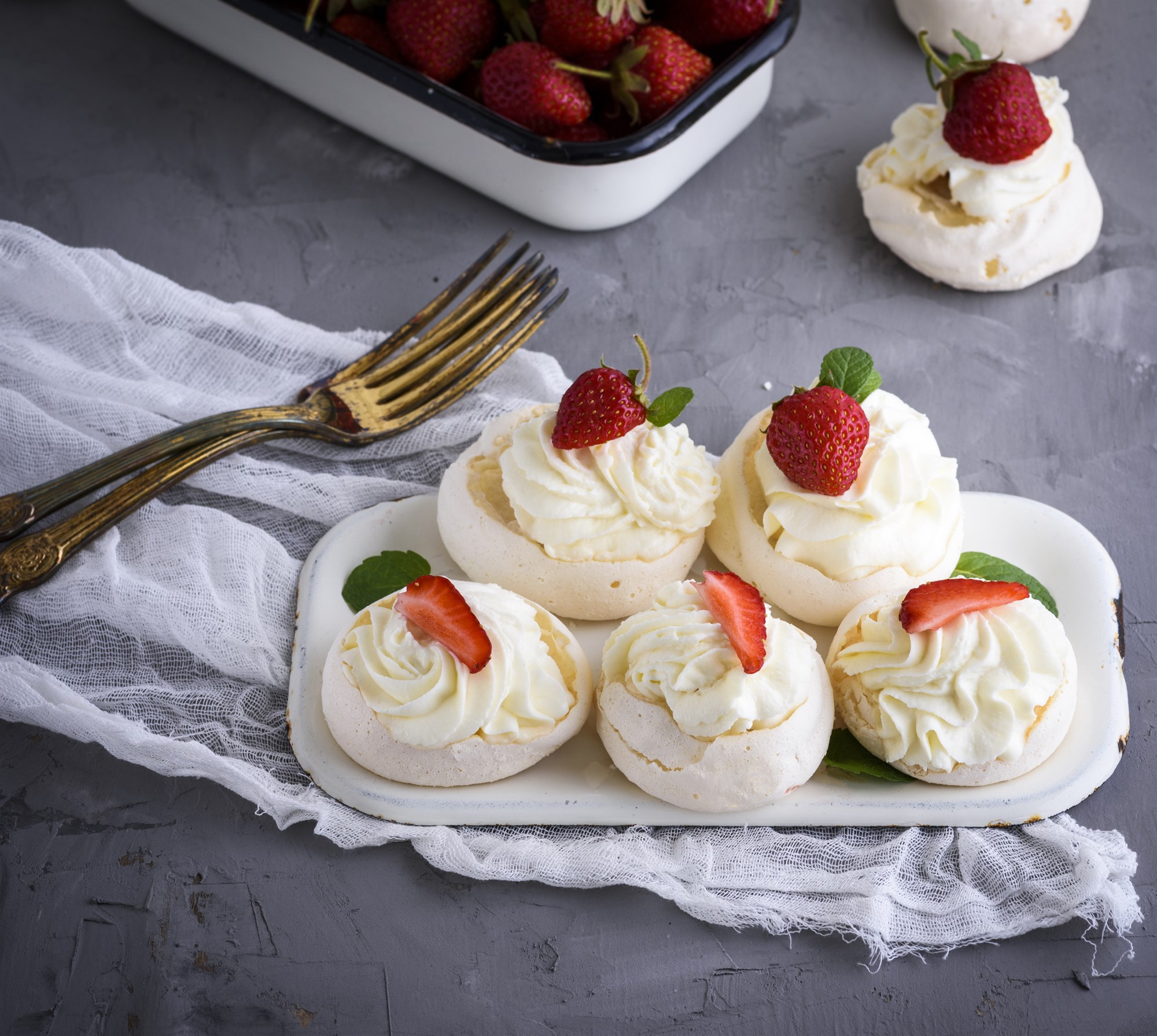 - Sprautið rjóma eða notið skeiðar viða að setja rjóma á hverja köku.