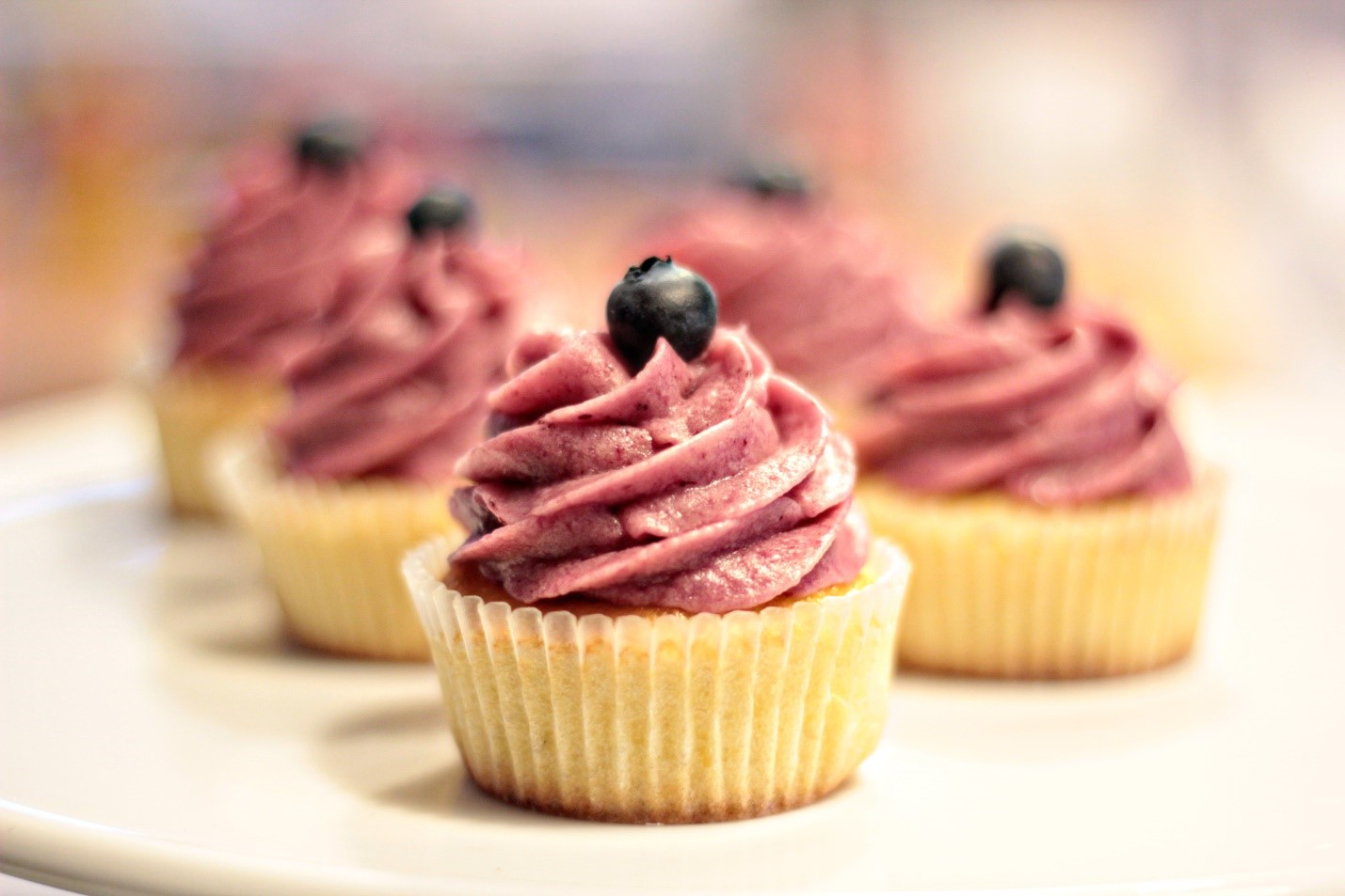 - Þegar bláberjablandan hefur náð stofuhita er henni blandað saman við kremið, skiljið þó eftir rúmlega 3 msk. af bláberjablöndunni til að skreyta kökurnar með.