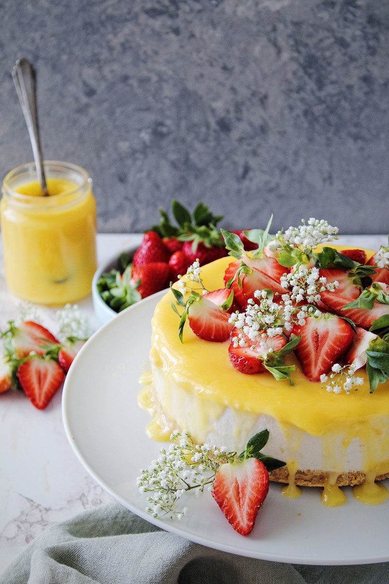 Þessi dásamlega fallega og sparilega terta er sannarlega boðberi hækkandi sólar, bjartsýni og gleði. Svo bragðgóð og fersk. Hún passar fullkomlega á páskaborðið eða í fermingarveisluna. Hún er í sjálfu sér ekki flókin í gerð en smá tíma tekur að útbúa hana en það er svo fullkomlega þess virði. Jarðarberjaskyrið og mascarpone rjómaosturinn tóna vel saman með lemon curd og ferskum jarðarberjum. Það er hægt að útbúa hana með góðum fyrirvara þar sem hún geymist vel í kæli.